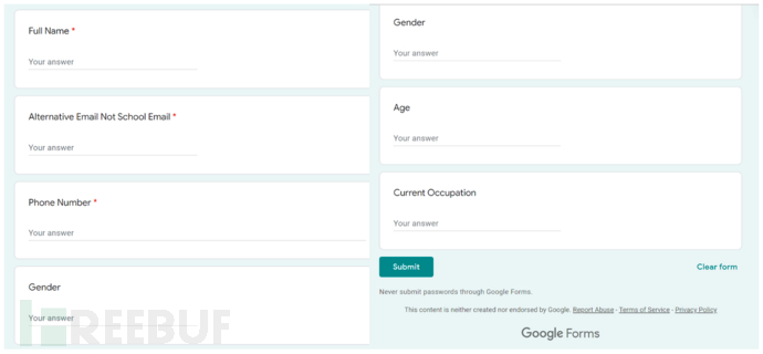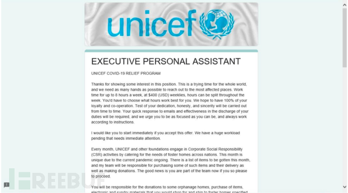 Proofpoint 分享了具体的案例,比如招募大学生担任联合国儿童基金会 (UNICEF) 行政个人助理,邮件中通过看起来非常官方的职位描述,并利用谷歌表单链接,引导受害者提供姓名、备用电子邮件地址、电话号码和其他个人详细信息。
