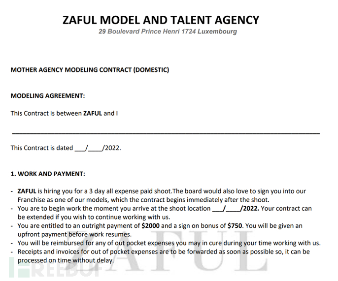 黑客冒充“星探”,称通过查看受害者的 Instagram信息,认为适合当模特,并进行一次为期3天的拍摄,邀约受害者通过电子邮件进行联系。研究人员联系了黑客,并通过环聊和 Gmail 展开了进一步沟通。黑客冒充快时尚品牌 Zaful 和 Fashion Nova,以此吸引对女性时尚感兴趣的学生。黑客还发送了一份“合同”,以进一步增强工作机会的真实性。