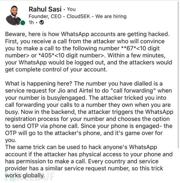 近日,CloudSEK 创始人 Rahul Sasi警告称,一个新的WhatsApp OTP 骗局正在被广泛利用,攻击者可以通过电话劫持用户的账户。